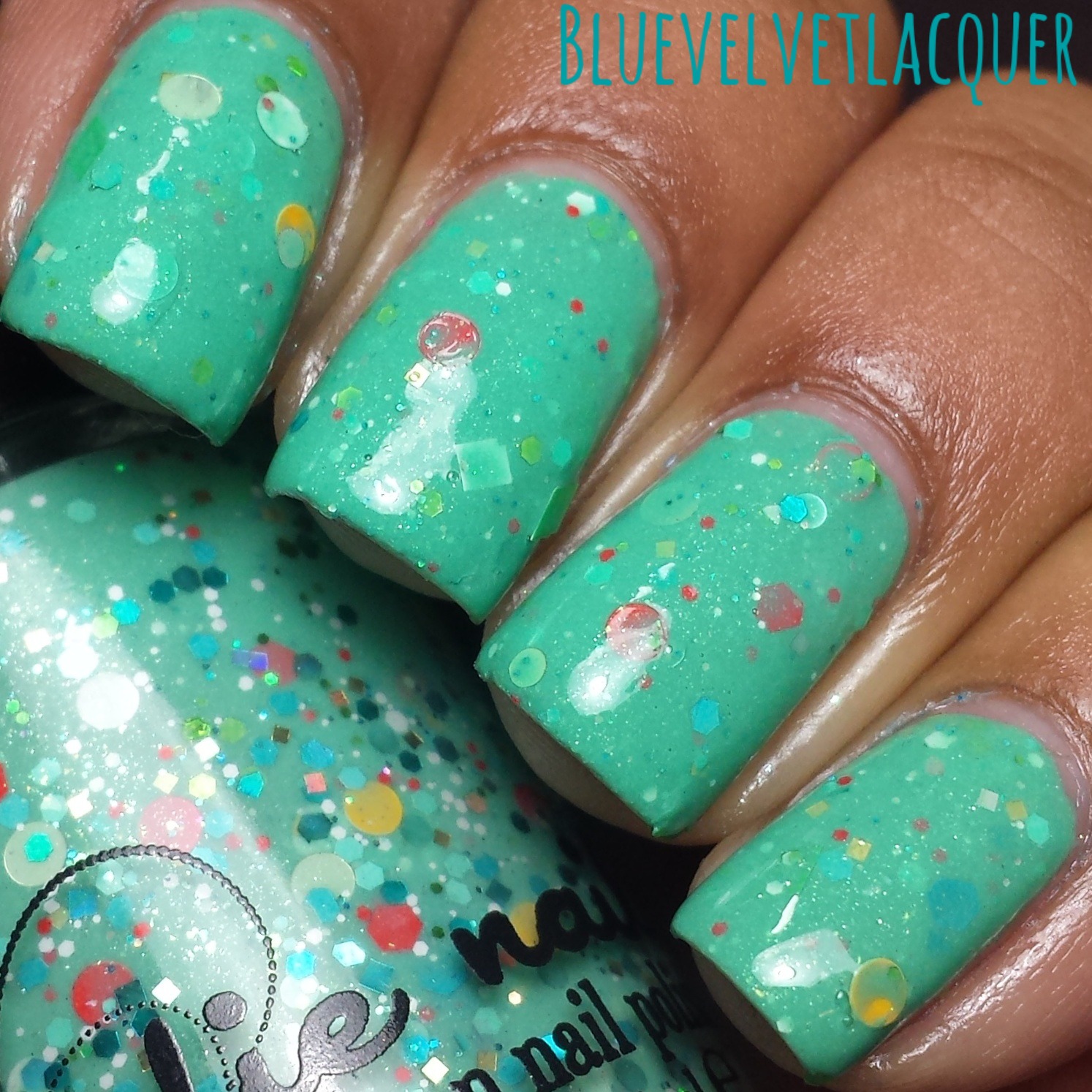 Freaks At The Fair. 3 coats. This a mint leaning green crelly with gold, white, red, blue, green and yellow glitters in different shapes like dots, squares, hexes, diamonds and micro glitter in different sizes. I love the base color for this polish it goes so perfect with the glitters combination. I did have a bit of trouble with the formula but i just added a few drops of nail polish thinner and it worked fine just make sure to flip it over a few minutes before applying to make all the glitters come down. Other than that I love this polish it's so unique, I don't know how Jen comes out with these great glitter combos.